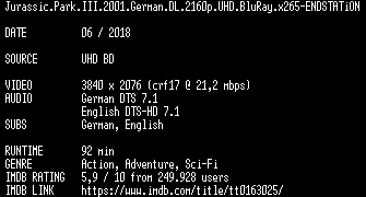 | FiLENAME: | Jurassic.Park.III.2001.German.DL.2160p.UHD.BluRay.x265-ENDSTATiON.mkv |