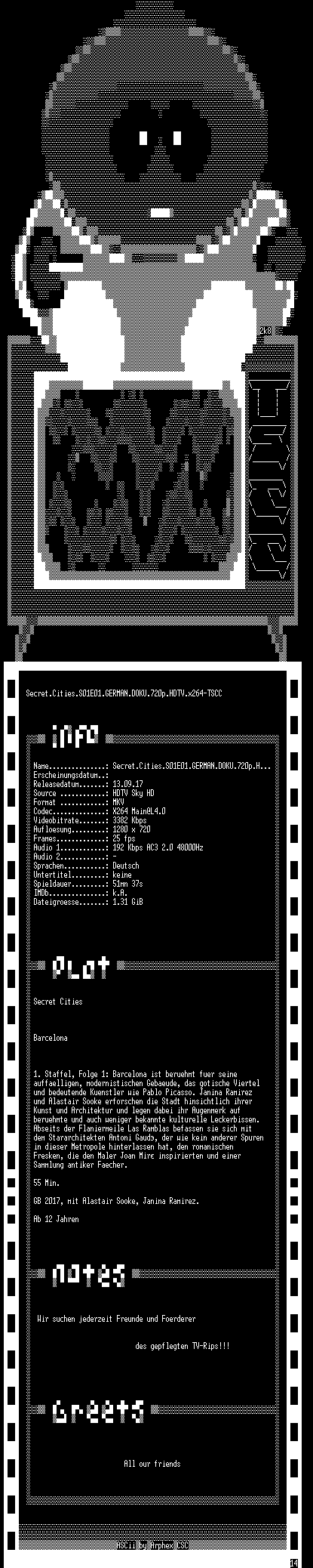 | FiLENAME: | Secret.Cities.S01E01.GERMAN.DOKU.720p.HDTV.x264-TSCC.mkv |