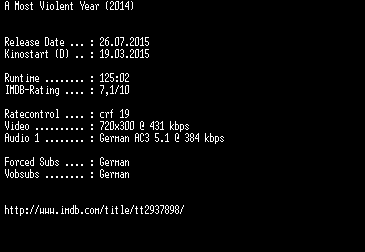 | FiLENAME: | A.Most.Violent.Year.German.2014.AC3.BDRiP.x264-EXQUiSiTE.mkv |