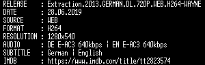 | FiLENAME: | Extraction.2013.GERMAN.DL.720P.WEB.H264-WAYNE.mkv |