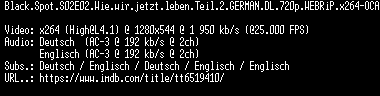 | FiLENAME: | Black.Spot.S02E02.Wie.wir.jetzt.leben.Teil.2.GERMAN.DL.720p.WEBRiP.x264-OCA.mkv |