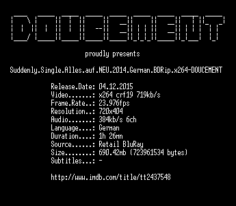 | FiLENAME: | Suddenly.Single.Alles.auf.NEU.2014.German.BDRip.x264-DOUCEMENT.mkv |
