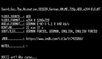 | FiLENAME: | Sword.Gai.The.Animation.S01E09.German.ANiME.720p.WEB.x264-BiGiNT.mkv |
