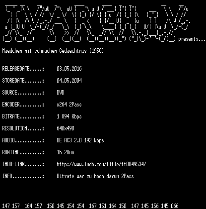 | FiLENAME: | Maedchen.mit.schwachem.Gedaechtnis.1956.German.DVDRip.x264.iNTERNAL-TVARCHiV.mkv |
