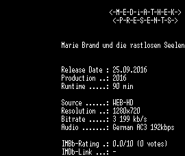 | FiLENAME: | Marie.Brand.und.die.rastlosen.Seelen.2016.German.720p.WebHD.h264-MEDiATHEK.mkv |
