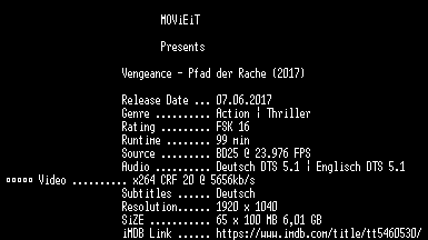 | FiLENAME: | Vengeance.Pfad.der.Vergeltung.2017.German.DL.1080p.BluRay.x264-MOViEiT.mkv |