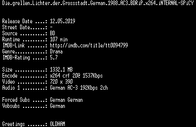 | FiLENAME: | Die.grellen.Lichter.der.Grossstadt.German.1988.AC3.BDRiP.x264.iNTERNAL-SPiCY.mkv |
