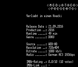 | FiLENAME: | Verliebt.in.einen.Knacki.German.DOKU.720p.WebHD.h264-MEDiATHEK.mkv |