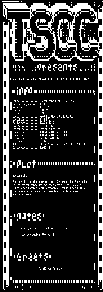 | FiLENAME: | Sieben.Kontinente.Ein.Planet.S01E03.GERMAN.DOKU.DL.1080p.BluRay.x264-TSCC.mkv |