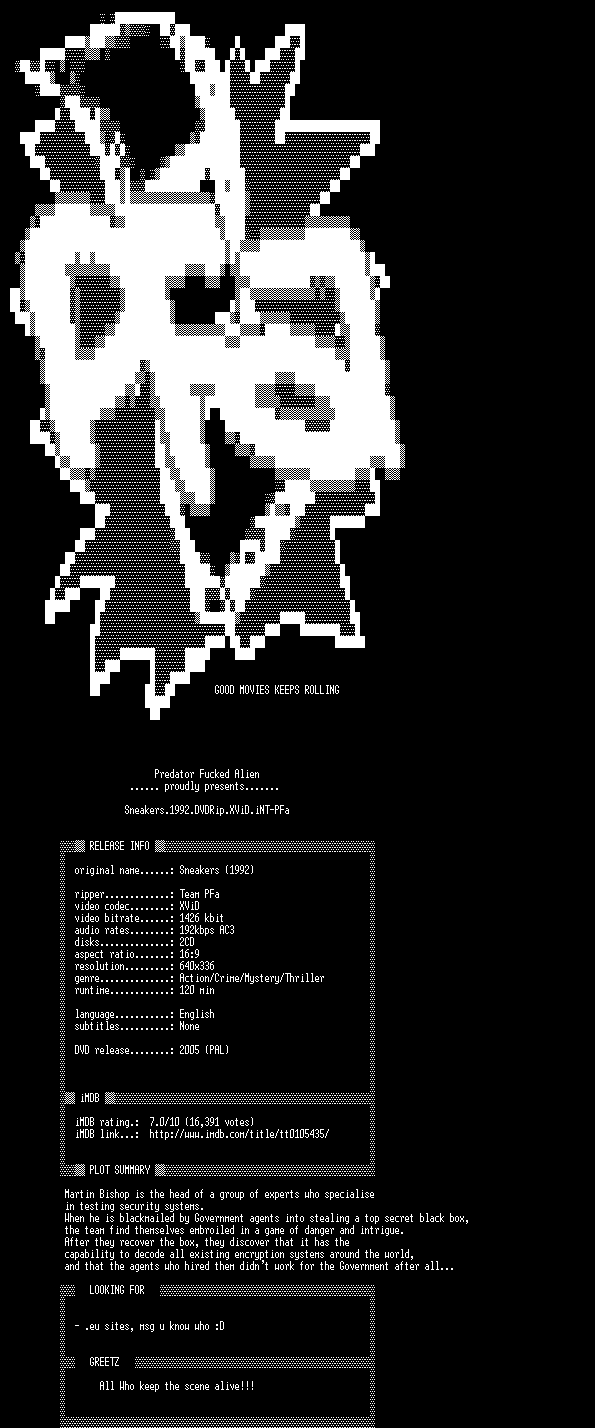 | FiLENAME: | Sneakers.1992.DVDRip.XViD.iNT-PFa.CD2.avi |