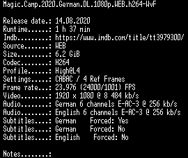 | FiLENAME: | Magic.Camp.2020.German.DL.1080p.WEB.h264-WvF.mkv |