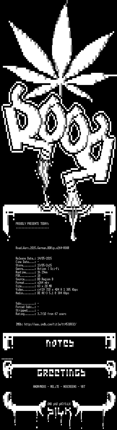 | FiLENAME: | Road.Wars.2015.German.BDRip.x264-ROOR.mkv |