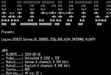 | FiLENAME: | Legion.S03E07.German.DL.DUBBED.720p.WEB.h264.INTERNAL-WiSHTV.mkv |