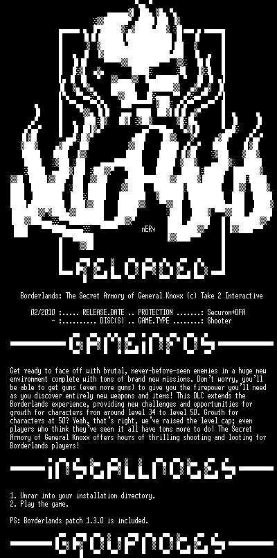 | FiLENAME: | Borderlands.The.Secret.Armory.of.General.Knoxx.DLC-RELOADED.rar |