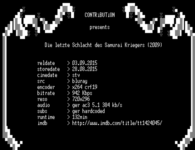 | FiLENAME: | Die.letzte.Schlacht.des.Samurai.Kriegers.2009.German.BDRip.x264-CONTRiBUTiON.mkv |