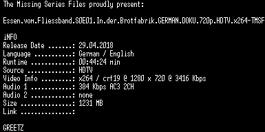 | FiLENAME: | Essen.vom.Fliessband.S01E01.In.der.Brotfabrik.GERMAN.DOKU.720p.HDTV.x264-TMSF.mkv |