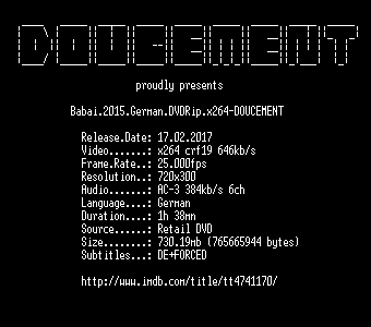 | FiLENAME: | Babai.2015.German.DVDRip.x264-DOUCEMENT.mkv |