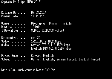 | FiLENAME: | Captain.Phillips.German.DL.1080p.BluRay.x264-EXQUiSiTE.mkv |