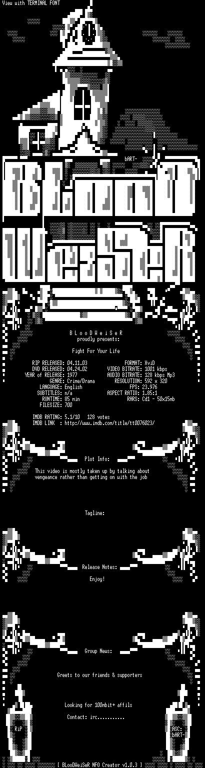 | FiLENAME: | Fight.For.Your.Life.1977.DVDRip.XviD-BLooDWeiSeR.avi |