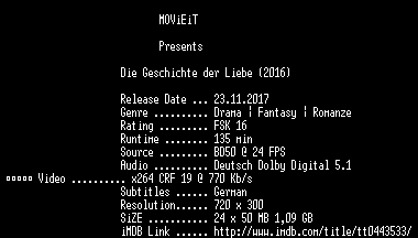 | FiLENAME: | Die.Geschichte.der.Liebe.2016.German.BDRiP.x264-MOViEiT.mkv |