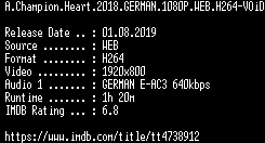 | FiLENAME: | A.Champion.Heart.2018.GERMAN.1080P.WEB.H264-VOiD.mkv |