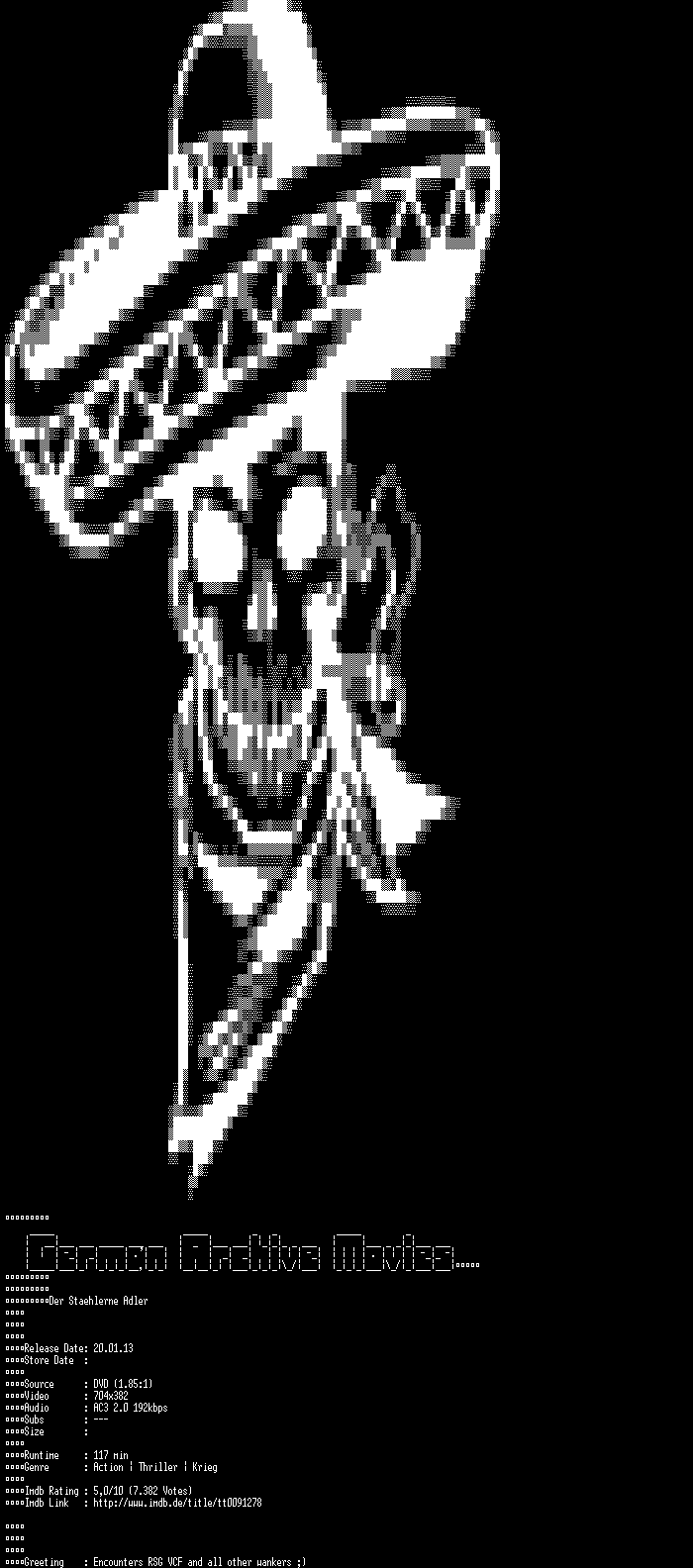 | FiLENAME: | Der.Staehlerne.Adler.German.1986.AC3.DVDRip.XviD.Internal-GAM.avi |
