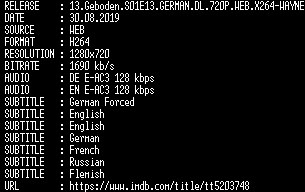 | FiLENAME: | 13.Geboden.S01E13.GERMAN.DL.720P.WEB.X264-WAYNE.mkv |