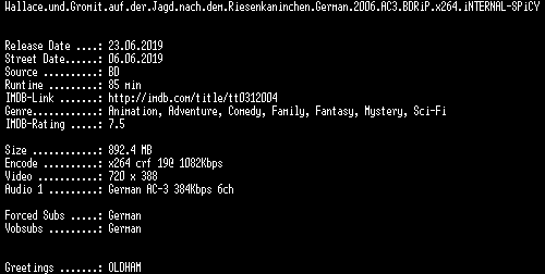 | FiLENAME: | Wallace.und.Gromit.auf.der.Jagd.nach.dem.Riesenkaninchen.German.2006.AC3.BDRiP.x264.iNTERNAL-SPiCY.mkv |