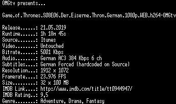 | FiLENAME: | Game.of.Thrones.S08E06.Der.Eiserne.Thron.German.1080p.WEB.h264-OMGtv.mkv |
