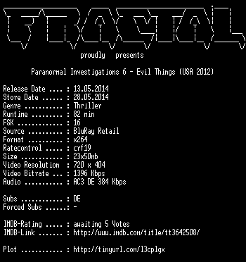 | FiLENAME: | Paranormal.Investigations.6.Evil.Things.German.2012.AC3.BDRip.x264-FRACTAL.mkv |