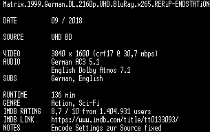| FiLENAME: | Matrix.1999.German.DL.2160p.UHD.BluRay.x265.RERiP-ENDSTATiON.mkv |