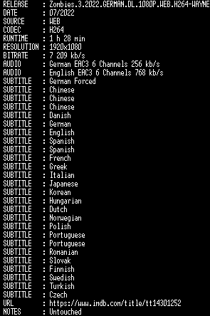 | FiLENAME: | Zombies.3.2022.GERMAN.DL.1080P.WEB.H264-WAYNE.mkv |