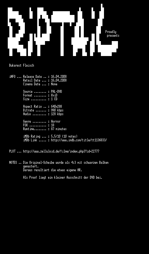 | FiLENAME: | Bukarest.Fleisch.German.2007.DVDRiP.XviD-RiPTAiL.avi |