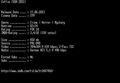 | FiLENAME: | Coffin.German.2011.AC3.DVDRiP.XViD-EXQUiSiTE.avi |
