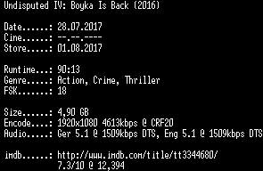 | FiLENAME: | Undisputed.IV.Boyka.Is.Back.2016.German.DL.1080p.BluRay.x264-CiNEViSiON.mkv |