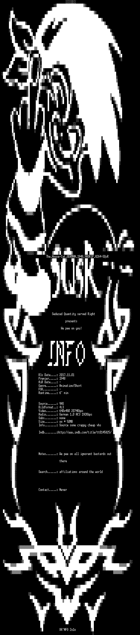 | FiLENAME: | The.House-Cat.GERMAN.1948.VHSRIP.X264-SQsR.mkv |