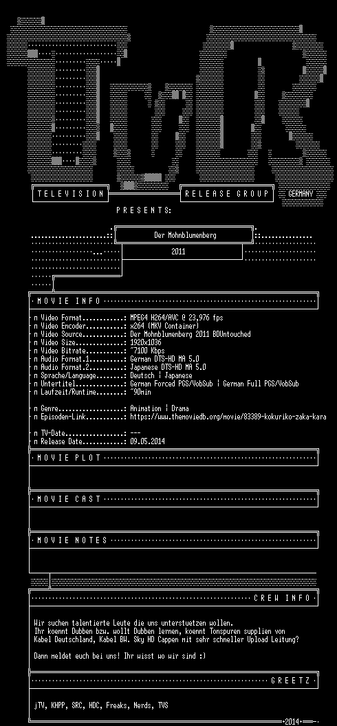 | FiLENAME: | Der.Mohnblumenberg.GERMAN.5.0.DL.DTSHD.ANiME.BDRiP.1080p.WS.x264-TvR.mkv |