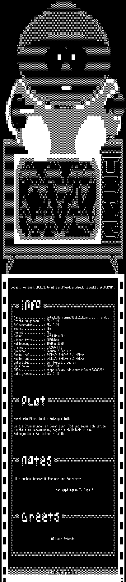 | FiLENAME: | BoJack.Horseman.S06E01.Kommt.ein.Pferd.in.die.Entzugsklinik.GERMAN.DL.1080p.WEB.x264-TSCC.mkv |