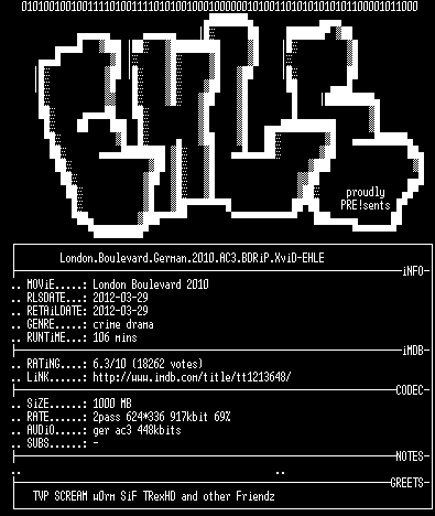 | FiLENAME: | London.Boulevard.German.2010.AC3.BDRiP.XviD-EHLE.avi |