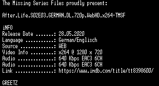 | FiLENAME: | After.Life.S02E03.GERMAN.DL.720p.WebHD.x264-TMSF.mkv |