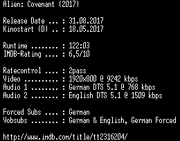 | FiLENAME: | Alien.Covenant.2017.German.DTS.DL.1080p.BluRay.x264-COiNCiDENCE.mkv |