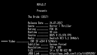 | FiLENAME: | The.Bride.German.2017.AC3.BDRip.x264-MOViEiT.mkv |