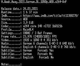 | FiLENAME: | A.Week.Away.2021.German.DL.1080p.WEB.x264-WvF.mkv |