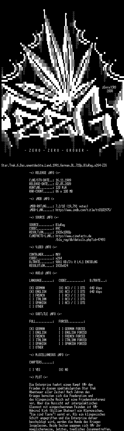 | FiLENAME: | Star.Trek.6.Das.unentdeckte.Land.1991.German.DL.1080p.BluRay.x264-ZZG.mkv |