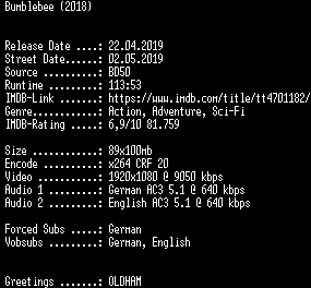 | FiLENAME: | Bumblebee.2018.German.DL.1080p.BluRay.x264-SPiCY.mkv |