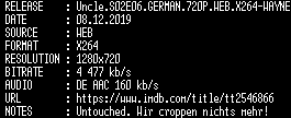 | FiLENAME: | Uncle.S02E06.GERMAN.720P.WEB.X264-WAYNE.mkv |