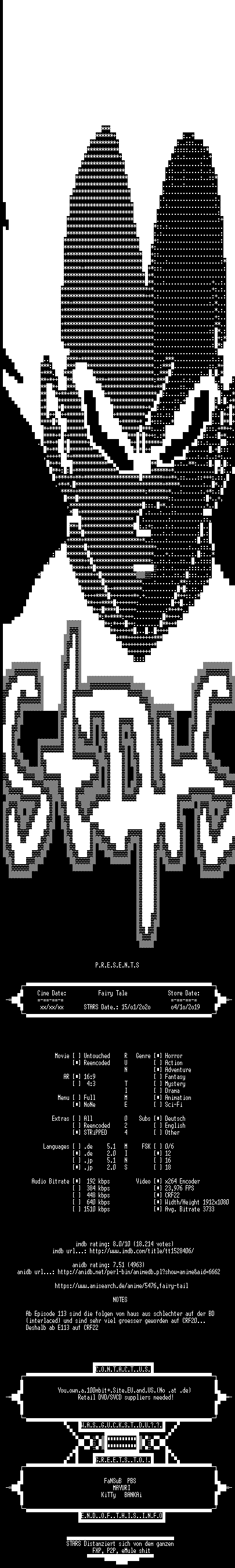 | FiLENAME: | Fairy.Tail.E167.100.Gegen.1.German.2009.ANiME.DL.1080p.BluRay.x264-STARS.mkv |