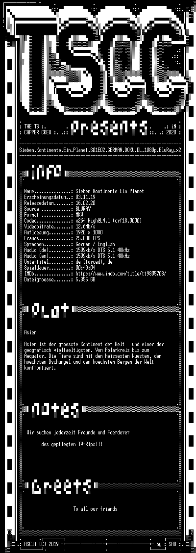 | FiLENAME: | Sieben.Kontinente.Ein.Planet.S01E02.GERMAN.DOKU.DL.1080p.BluRay.x264-TSCC.mkv |