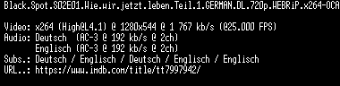 | FiLENAME: | Black.Spot.S02E01.Wie.wir.jetzt.leben.Teil.1.GERMAN.DL.720p.WEBRiP.x264-OCA.mkv |