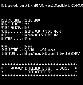 | FiLENAME: | Bullyparade.Der.Film.2017.German.1080p.WebHD.x264-SLG.mkv |